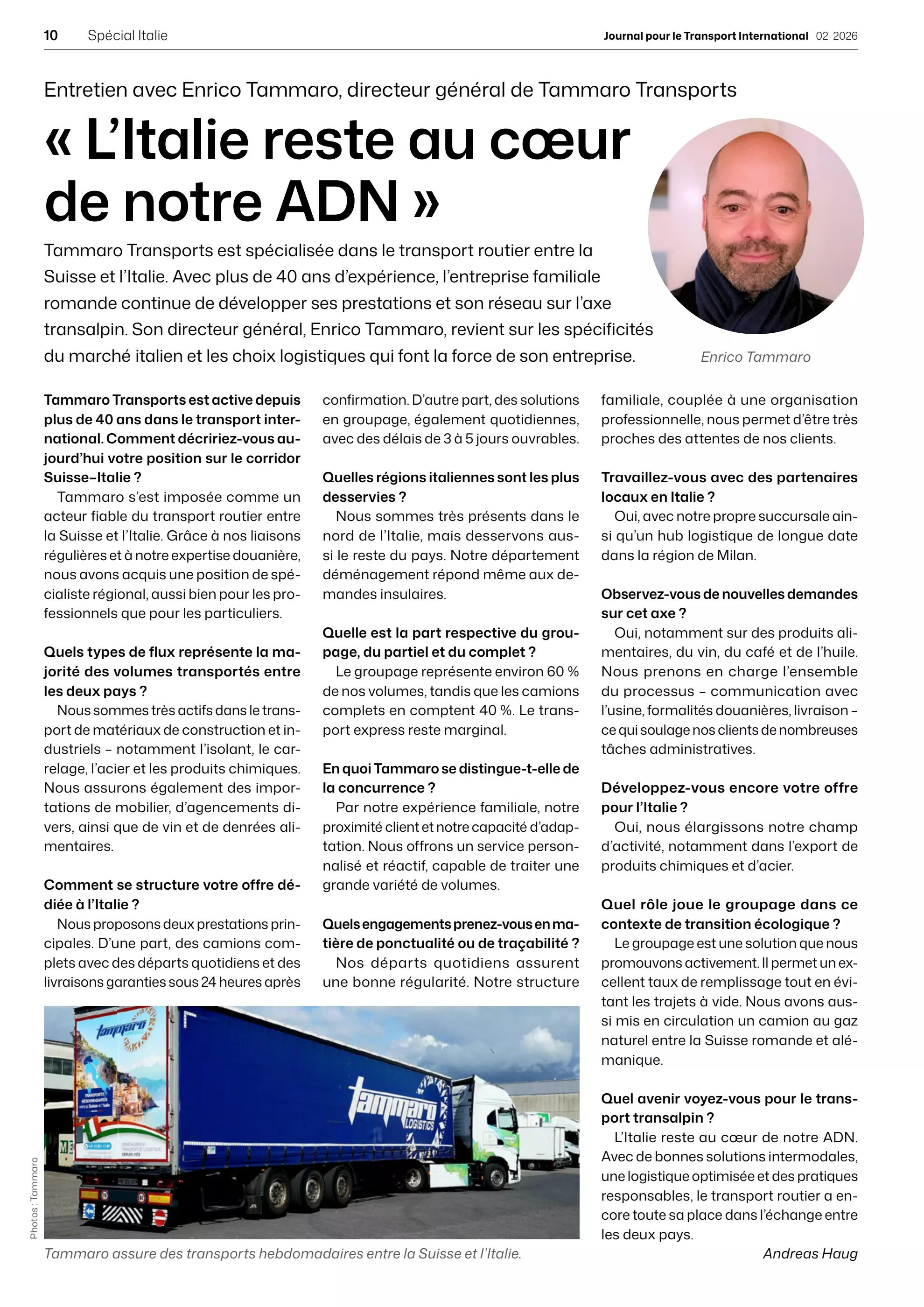 Tammaro Transports est spécialisée dans le transport routier entre la Suisse et l'Italie. Avec plus de 40 ans d'expérience, l'entreprise familiale romande continue de développer ses prestations et son réseau sur l'axe transalpin. Son directeur général, Enrico Tammaro, revient sur les spécificités du marché italien et les choix logistiques qui font la force de son entreprise.